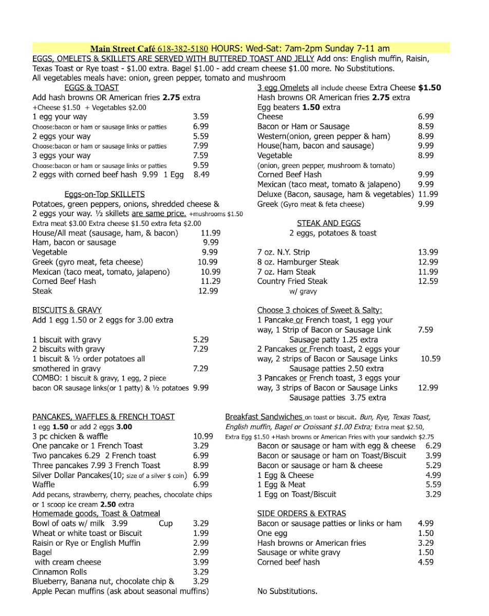 Carmi’s Main Street Café offers a straightforward, inviting menu that feels like a comforting pause in your day. You'll find classic American dishes served throughout the day, from hearty breakfast skillets and omelets to satisfying sandwiches and soups that suit a range of appetites.